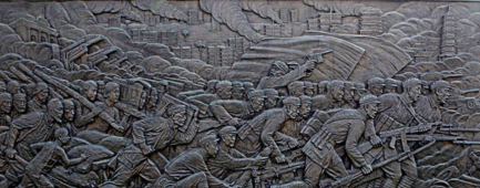 军史浮雕位于广场中心四周,树立八块中国人民解放军军事题材的浮雕。分别是南昌起义、秋收起义、井冈山斗争、红都瑞金、万里长征、敌后抗日、解放战争、钢铁长城。其背面是江西现有的八个国家级风景名胜区,即以井冈山、庐山、三清山、三百山、龙虎山、仙女湖、梅岭、龟峰为题材的山水浮雕。