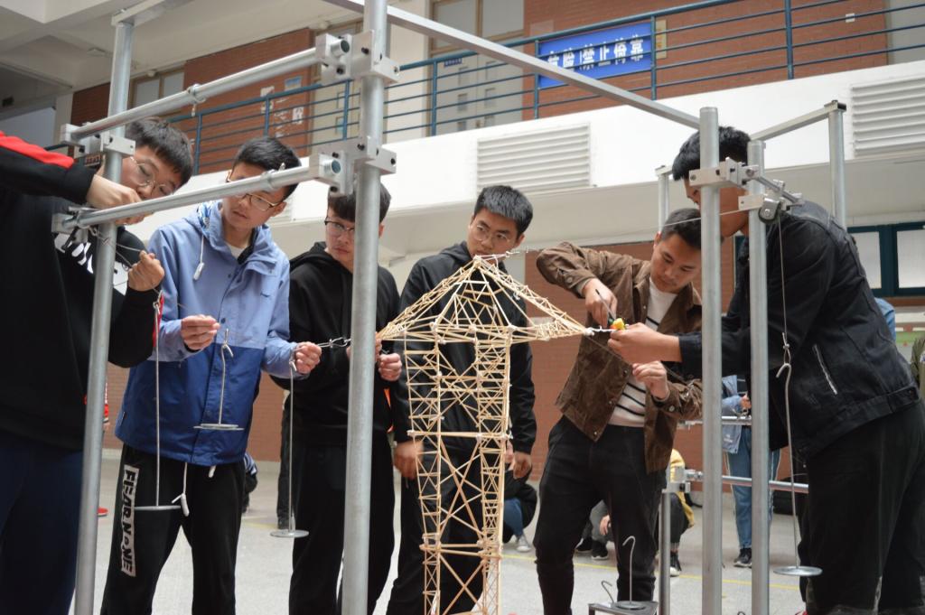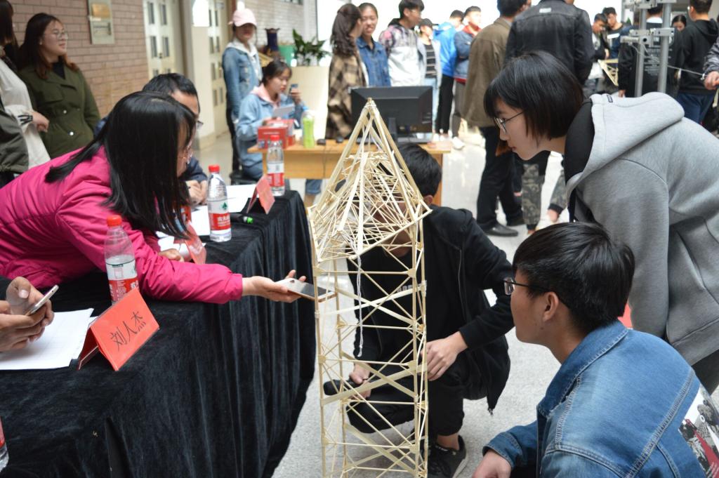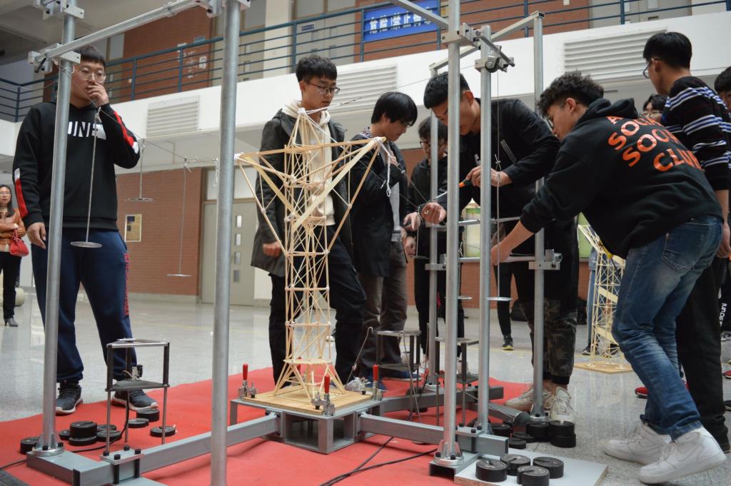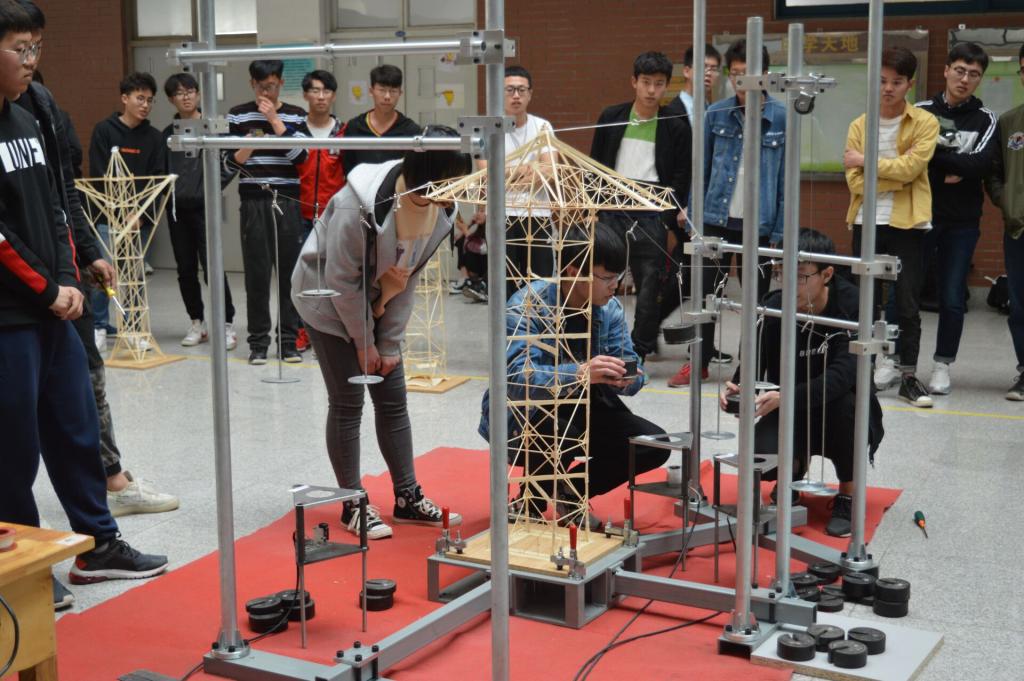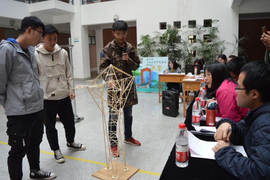 上午九点,各参赛队伍结束结构制作并自觉做好卫生工作,保持场地整洁干净,然后依次承重结构质量,并提前固定好结构,以节约比赛时间。下午一点,首先由主持人介绍比赛性质,比赛正式开始。参赛队伍先进行答辩,介绍结构的具体承载能力、加载点、结构的特点,由评委老师进行打分,然后评委老师提问,队员解答,至此答辩结束。紧接着是加载环节,由于各个参赛队伍制作结构的不同,所加载的情况则不同。比赛细节由裁判记录,各个队伍依次进行。最后由计分处算分排名,综合计算书、现场答辩及加载情况得出本次比赛的前三名分别是小毛竹、先锋队、国赛第一名三支队伍。本次比赛设有一二三等奖三个级别,获得一等奖的队伍是小毛竹,获得二等奖的队伍是先锋队和国赛第一名,获得三等奖的是展翅队、九天揽月和三合松鼠。以上队伍在比赛各个环节表现突出,取得了优异的成绩。其他队伍积极参与,融入此次比赛,相信也有不少的收获。