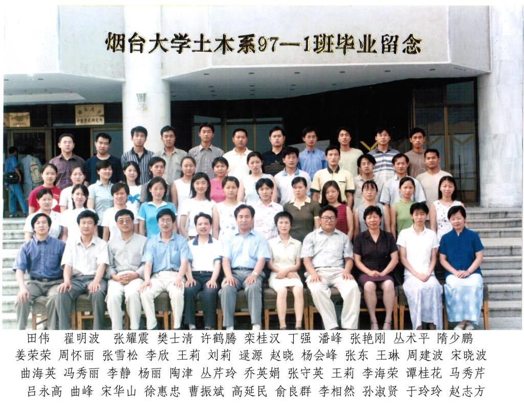 第1排(老师):吕永高 初明进 曲峰 宋华山 曹振斌 高延明 徐惠中 李相然 赵志方 孙淑贤 于玲玲 俞良群